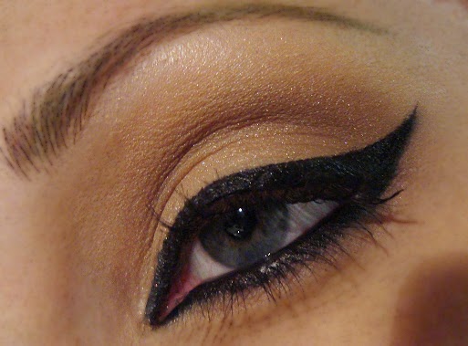 Hago una linea gruesa con eyeliner negro trazando un rabillo bastante largo, hacia arriba.