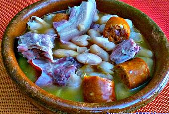 Agregar al caldo y remover. De esta manera el líquido quedará más ligado y la fabada más consistente, sacamos la panceta, los chorizos y las costillas y lo troceamos y añadimos a la fabada, Sacar a la mesa bien caliente y listo para servir. (Se le puede añadir una morcilla cocida aparte).Receta elaborada con el menaje de hostelería y cocina de la fábrica Supreminox en Vilassar de Mar (Barcelona).