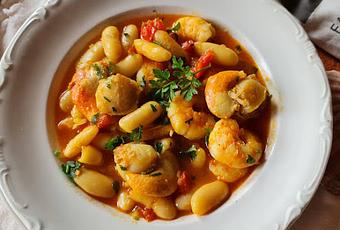 Por aquí estos días, está ya un tiempito para platos de cuchara y cosas calentitas; no es que haga mucho frío todavía, pero la lluvia y la humedad invitan a calentar el cuerpo, y las previsiones para los próximos días no son buenas, así que hay que combatirlo conveniente. En casa lo hemos hecho con una fabas de Lourenzá, unas legumbres autóctonas que son una verdadera delicia; y para darle un aire festivo le añadí langostinos y vieiras. El resultado no podía ser mejor, resulto un plato exquisito del que disfrutamos una barbaridad.