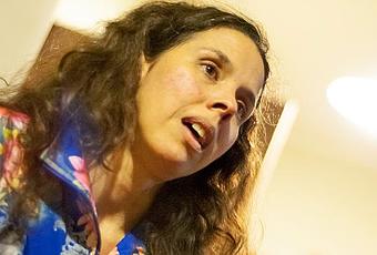Fabiola Alcázar frente al escenario de Prometeo Encadenado, versión libre del mito griego. / Foto: Javier Gragera