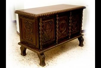 Detalle del labrado del cuarterón central del arcón estilo barroco.