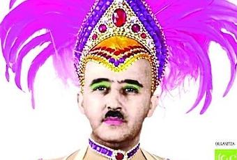 Una divertida imagen de Francisco Franco travestido de Drag Queen, tiara de plumas sobre su cabeza, su bigote y mirada seria, gran collar de colgantes morados, vestido de abalorios y brillantes gemas al inicio de los pechos.