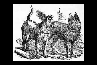 Mientras caminaban hacia la casa del amo del mastín, el lobo se dio cuenta que el perro tenía el cuello pelado. "¿Qué es eso? preguntó. -Nada.- ¡Cómo nada! -Una tontería.- Pero algo es, esa peladura en el cuello. -Será la señal del collar con el que aveces estoy atado.- ¡Atado! exclamó el lobo: tu ¿No vas y venís a donde querés? -No siempre, pero eso, ¿qué importa? -Importa tanto, que no quiero ni el mas grande de los tesoros, por renunciar a mi libertad." Termino de decir el lobo, y se alejó corriendo, sin mirar atrás.