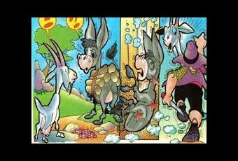 Una cabra y un asno comían al mismo tiempo en el establo. La cabra empezó a envidiar al asno porque creía que él estaba mejor alimentado, y le dijo: “Entre la noria y la carga, tu vida sí que es un tormento inacabable. Finge un ataque y déjate caer en un foso para que te den unas vacaciones”.Tomó el asno el consejo, y dejándose caer se lastimó todo el cuerpo. Viéndolo el amo, llamó al veterinario y le pidió un remedio para el pobre. Prescribió el curandero que necesitaba una infusión con el pulmón de una cabra, pues era muy efectivo para devolver el vigor. Para ello entonces degollaron a la cabra y así curar al asno.