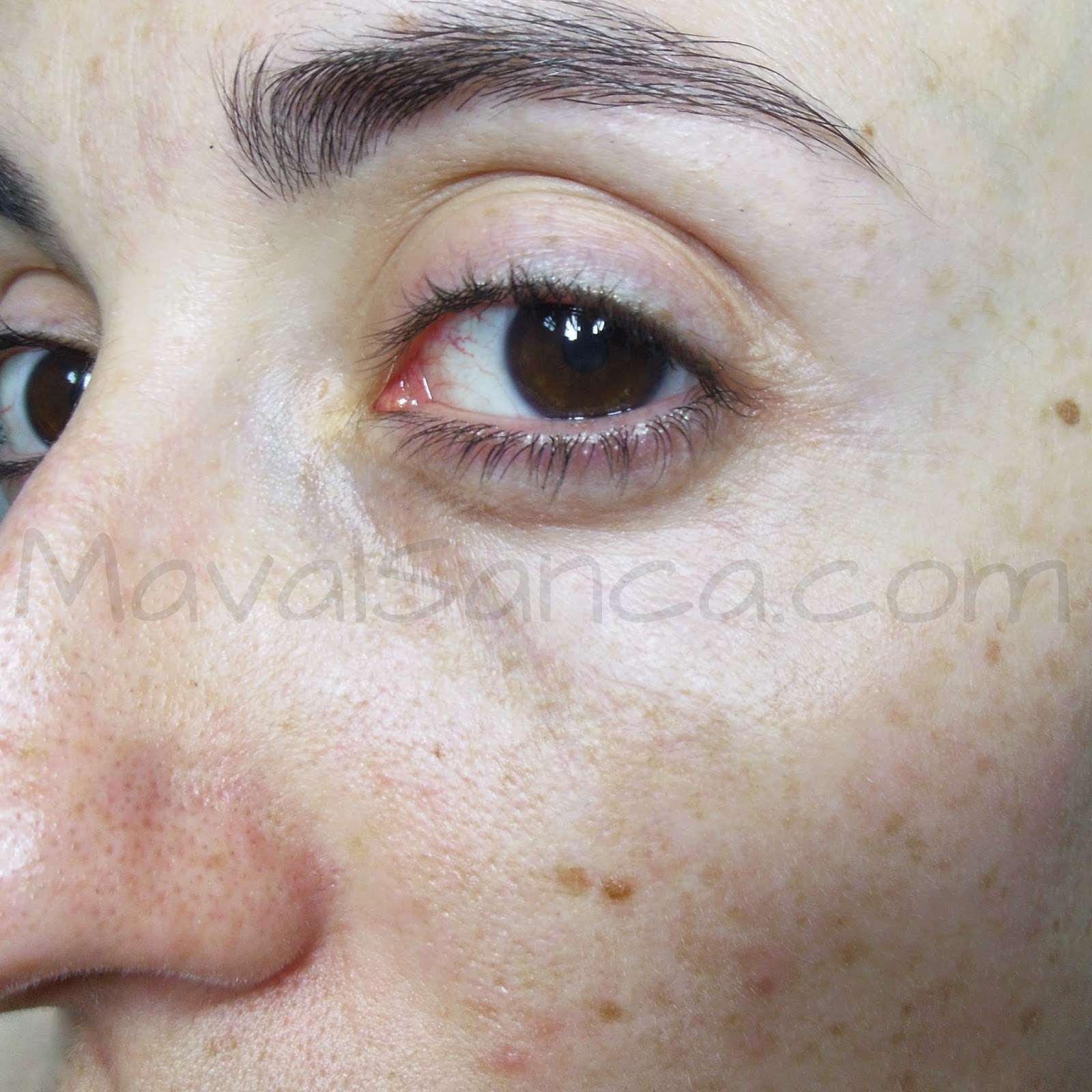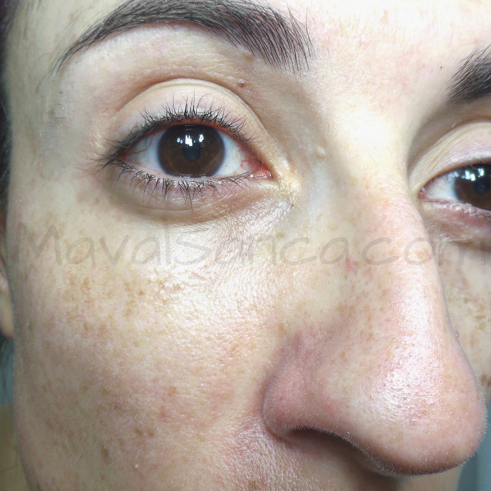 He aplicado únicamente crema hidratante y contorno de ojos.Cómo veis tengo los poros dilatados en la nariz, algunas irregularidades en el tono de la piel y algún grano.