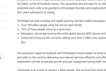 Y esta vez, el precio fue bastante elevado: u$s 19.000 millones de dólares, para una empresa que sólo cuenta con 35 empleados, 450 millones de usuarios activos, 1 millón de usuarios nuevos por día. Y de ellos, casi el 70% participa activamente todos los días. Números demasiado buenos, como para dejarlos pasar.