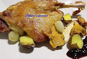 INGREDIENTES (para 2 personas): 2 muslos de pato en confit, 200 gramos de papas pequeñas (en esta ocasión son papas bonitas, variedad típica de Canarias), 150 de boletus edilus grandes (o cualquier seta al gusto), 100 gramos de otra variedad de setas que les guste, 12 chalotas (o cebollas pequeñas), 75 gramos de fresas y 75 de moras (rojas y negras combinadas hasta llegar a los 75 gramos), aceite de oliva, sal, ajo en polvo, orégano, agua, una cuchara pequeña de azúcar, brandy (o un rico oloroso).