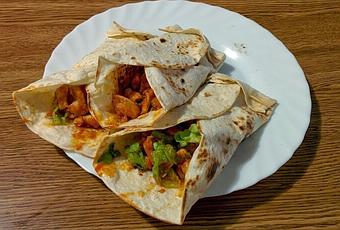 FAJITASIngredientes: pollo troceado, cebolla, pimiento rojo y verde, tortillas de trigo, pimentón picante, guindilla, salsa de tomate, avecrem, lechuga, orégano, cerveza.