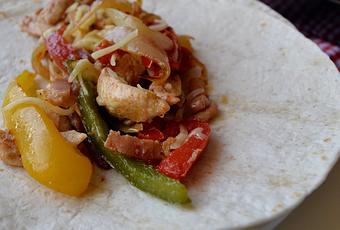 1 Paquete de tortillas de trigo.1 Pimiento rojo.1 Pimiento verde.1 Pimiento amarillo.1 Cebolla.1 Pechuga de pollo.100 gr. de bacon a tiras.Queso rallado.