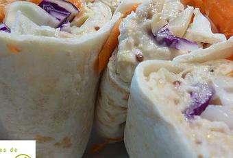 Trituramos el pollo que ya está cocinado en la thermomix, luego lo mezclamos con la mayonesa, la mostaza, el curry, la sal y la pimienta. Mezclamos bien, provamos y rectificamos. Untamos una tortita con la mezcla, le colocamos por encima la col y zanahoria, envolvemos y partimos a la mitad.