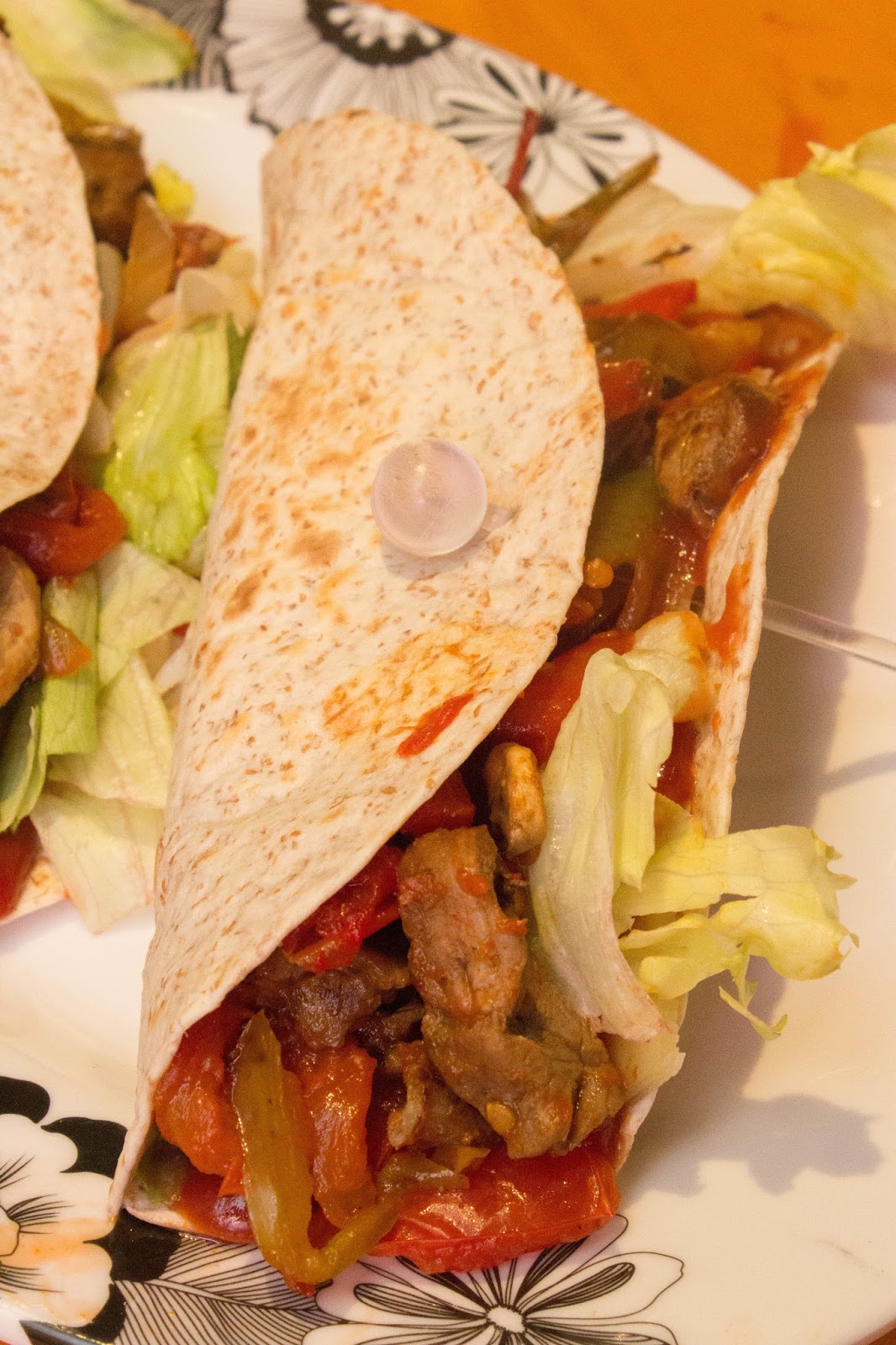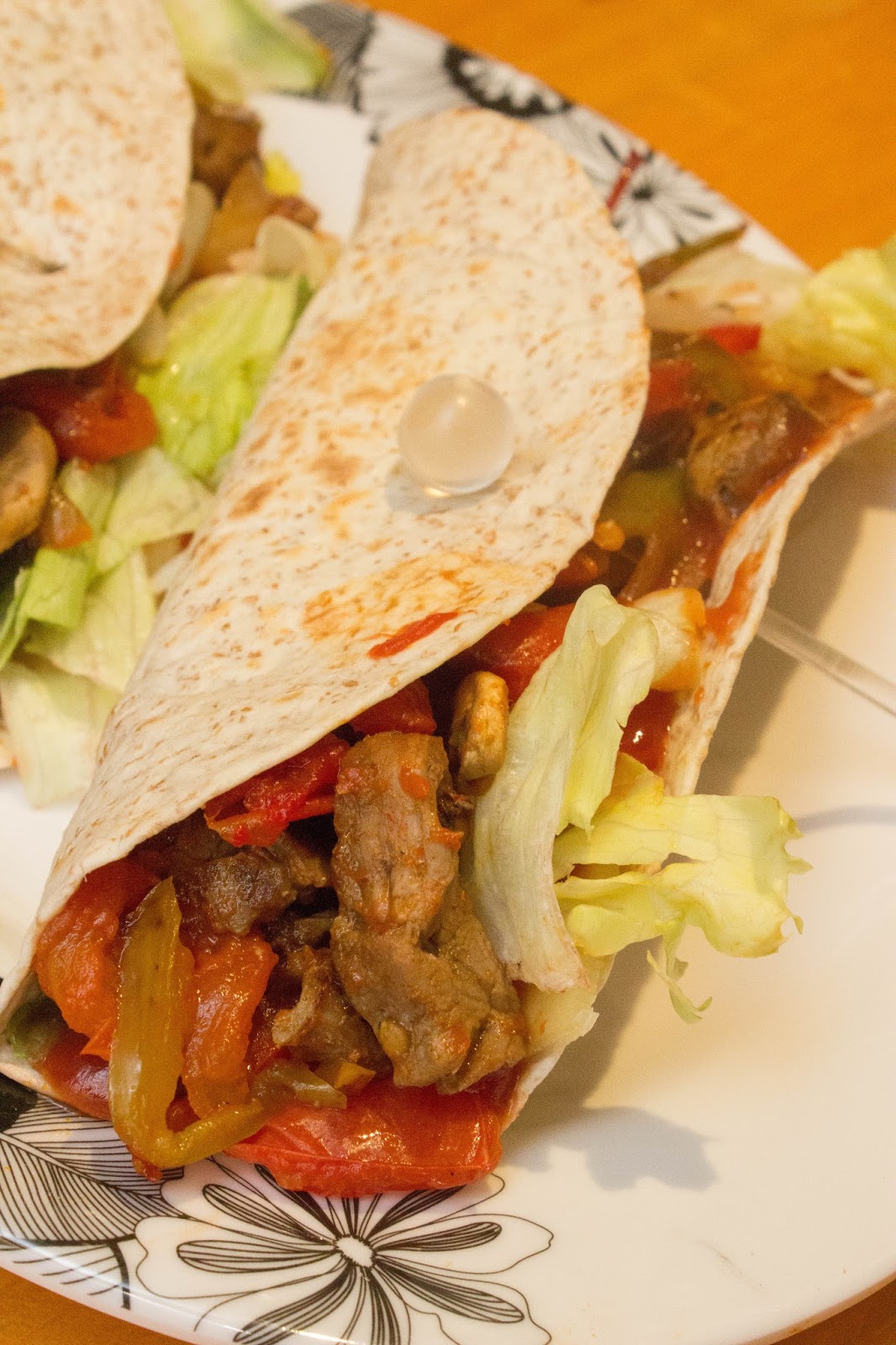 Ingredientes para una persona:120 g de ternera120 g de tomate60 g de pimiento30 g de champiñones50 g de cebollamedia cucharada de aceite4 cucharadas de kepchup4 cucharadas de mayonesa2 tortitas de fajitas60 g de lechuga1 loncha de queso light