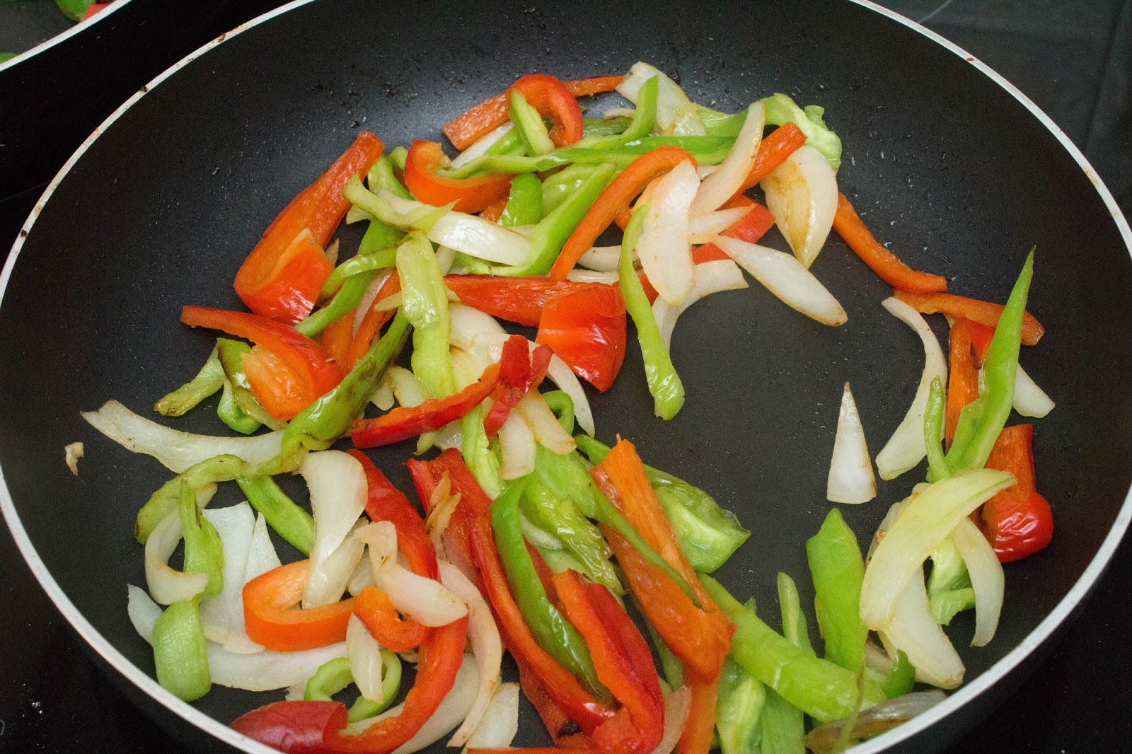 Cortar pimiento rojo y verde en tiras finas, y la cebolla.