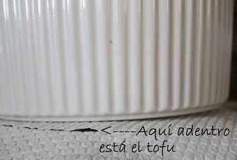 Lo primero al cocinar tofu es remover el exceso de agua, por lo tanto, se tiene que abrir el paquete, removerlo con cuidado y colocarlo en un plato hondo entre dos toallas de papel absorbentes. Para que se exprima bien, es importante ponerle encima algo pesado. Yo pongo un recipiente de cerámica como en la foto.