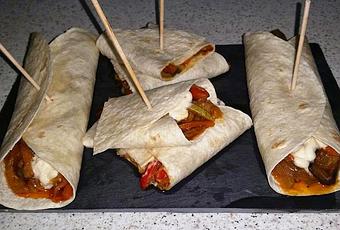 Troceamos las verduras, las ponemos en una sarten con un chorrito de aceite y salteamos. Cuando las verduras estén tiernas añadimos el tomate frito, un poco de sal y pimienta molida. Mezclamos todo bien,dejamos a fuego bajito durante 5 min y reservamos.Calentamos en el micro las tortillas de trigo y rellenamos con las verduras, añadimos un poco de salsa de yogur (al gusto),cerramos y listas para comer.