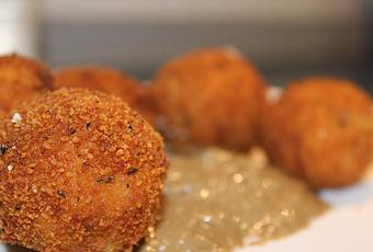 Ahora hacemos bolas pequeñas, lo pasamos primero por huevo y después por pan rallado.Cuando tengamos las bolas mezclada con el huevo y el pan, freímos en abundante aceite de oliva o en la freidora hasta que queden bien doradas.Yo lo hice con salsa tahini que esta buenisimo.Tendremos un plato muy rico y sabroso.