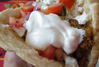 A la hora de servir, abrir los panes y rellenar con falafel acompañados del picado de tomate, un poco de queso feta y la salsa de yogur por encima. ¡A disfrutar!