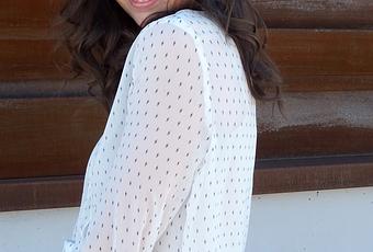 Blusa/ shirt: Mango (blusa blanca estampada similar); Zapatos/heels: Pull&Bear (zapatos nude similares); Falda/skirt: Mango (falda recta similar);
