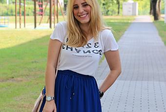 Hoy os traigo un outfit un poco arriesgado para una chica bajita, y es que aunque me encanta el toque de llevar la falda larga de una forma más sport al no ser muy alta pensaba que me haría parecer aún más chiquitita. Pero, señoras y señores, oye, lo mono que ha quedado el look, ¿no? Camiseta sencilla, mi falda azulona, las victorias con plataforma, bolso con detalle rosa... ¡y tchan! ¡Meeeee encanta! ¿Qué os parece?