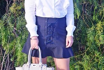El look de hoy es un outfit de working girl que junta varias tendencias: rayas diplomáticas y volantes. Este outfit es perfecto para ir a la oficina vistiendo a la última y con un toque formal. La falda que llevo es de rayas y con un detalle de cordones lace up en la parte delantera.