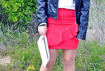 El rojo es un color que últimamente me está enganchando mucho, y estoy incorporando a mi armario prendas de este color. Hoy os muestro un look con un punto rockero, que le aportan los botines de grabado de cococrilo (sintético ) y la biker negra. Aunque la auténtica protagonista del outfit es la falda roja con volante delantero.