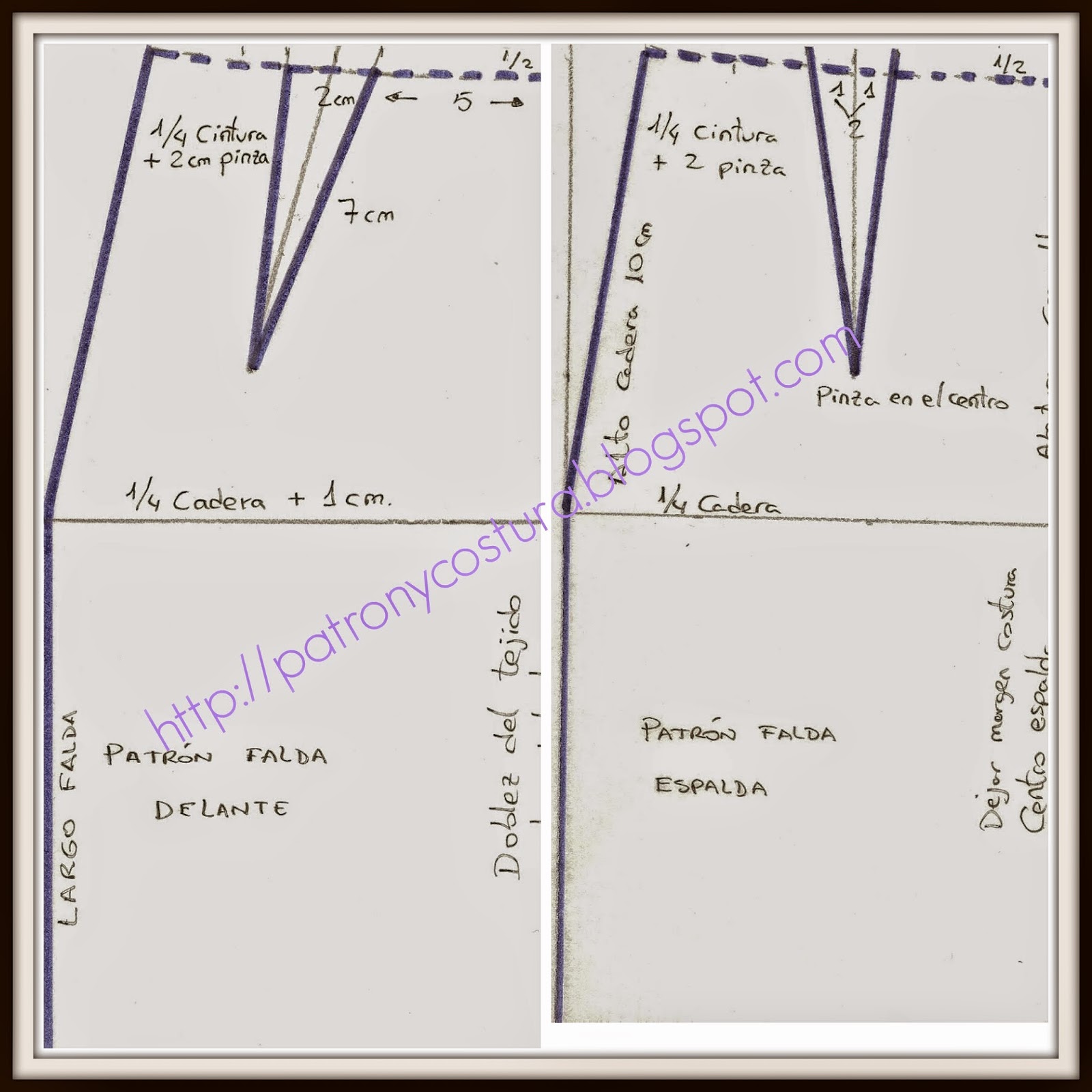 Siempre que tomemos las medidas, anotar los cálculos al lado, así es más difícil equivocarnos.Para hacer el patrón en pequeño, las pinzas las vamos a poner a 2 cm. y en lugar de en 1/4 del delantero añadir 2, añadimos +1. PATRÓN DE DELANTE FALDAEmpezamos con el patrón de delante marcando la cuarta parte de la cadera + 1 cm a todo el largo de la falda, y a 10 cm marcamos el alto de cadera . Seguidamente marcamos la cuarta parte de la cintura + 2 cm de pinza; ésta la pondremos a 5 cm midiendo desde el centro delante y las ponemos a 7 cm de largas.Y está terminado la parte de delante.PATRÓN DE LA PARTE DE DETRÁS DE LA FALDALa parte de detrás igual, marcamos la cuarta parte de la cadera y hacemos una línea a lo largo, después marcamos el alto de cadera a 10 cm. y nos queda la cintura la 1/4 parte + 2 cm para la pinza que va en el centro. La pretina se puede hacer una tira a todo lo larga de la cintura recta ( versión fácil) ó podemos molestarnos un poquito y casar los patrones por la zona de la cadera y dibujar la forma sobre un papel patrón y darle los centímetros que queramos de ancha y nos quedará ideal.Nota: en ambas partes en la zona de la cintura le he bajado 1/2 cm con una curva suave, esto evita que se haga arruga en esa zona. Cuando hagamos un patrón con medidas reales nuestras ponemos 1 cm de bajada.