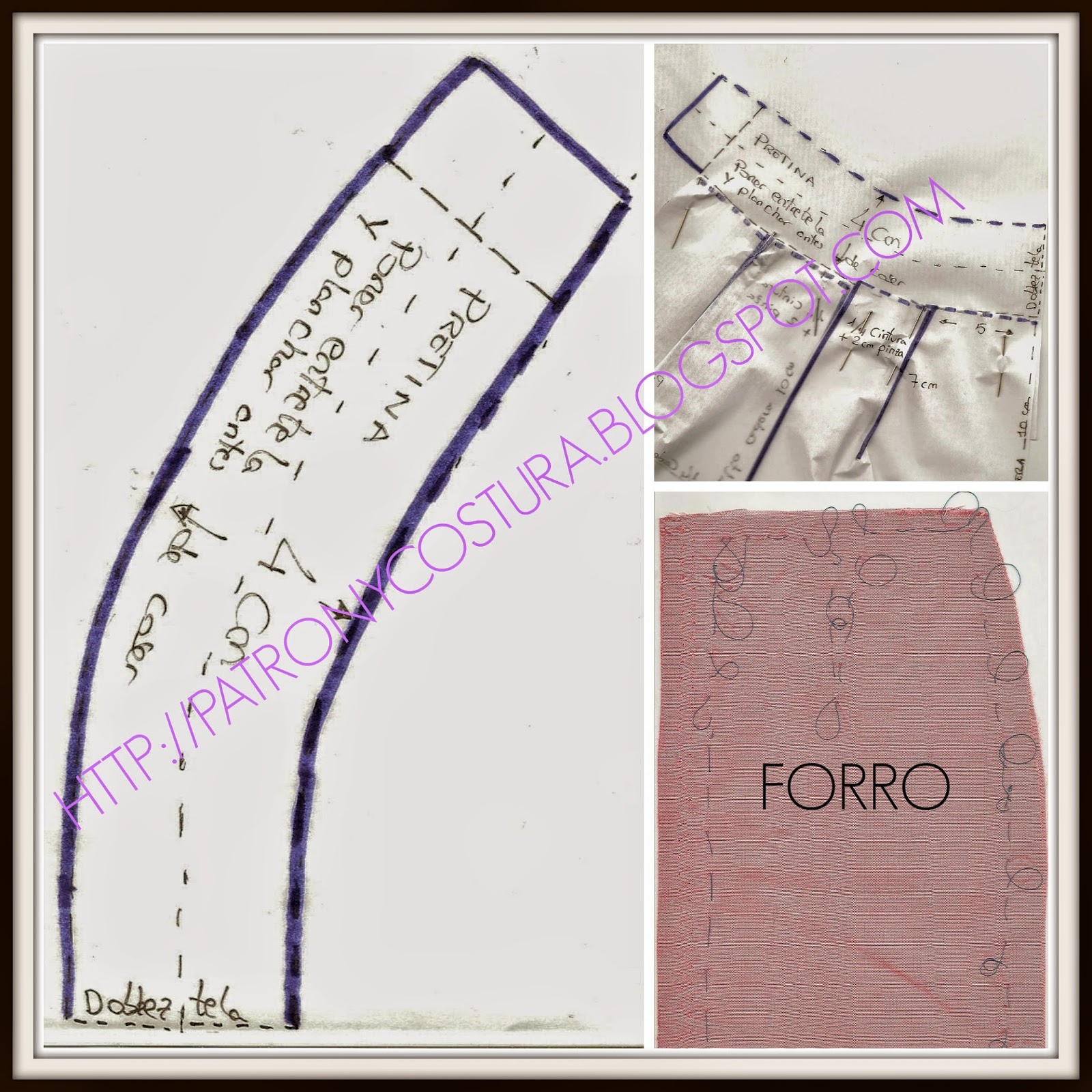Colocamos en patrón de delante en el doblez de la tela. En la parte de la espalda dejamos margen para costura en el centro. La pretina cortamos dos iguales, a una de ellas le planchamos entretela
