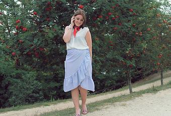 La falda del momento es sin duda la falda wrap, como ya os hablé de ella en un post de la semana pasada, es la reina de la faldas y esta que os enseño hoy de mi e-shop @besosdechocolateyfresashop, reúne varias tendencias en una, los volantes, el estampado navy a rayas y el corte midi con el wrap, como si de un pareo se tratase. Para esta ocasión decidí combinar la falda con prendas sencillas pero con un toque chic, ya sea la blusa de gasa con abalalorios y piedras en los hombros, las sandalias tipo pala de piel de serpiente en rojo y la bandana para darle un toque de color y desenfadado al look. Falda cómoda y versátil ideal para cualquier ocasión Esta falda además es súper versátil pues tanto le podemos dar un rollo sport con sneakers o sandalia plana y camisetas básicas como algo más formal con camisas/blusas y tacones. ¿Qué os parece el resultado? ¿Ya tenéis en vuestro armario una falda de este tipo? Espero que os haya gustado. Besos y feliz día!