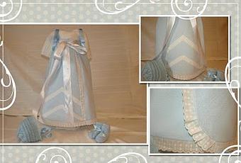 Faldón de piqué azul adornado con tiras bordadas en la pala central y rematado todo alrededor con un volantito.Lo hemos combinado con un jersey blanco con los lazos de raso en azul.Capotita y patucos a juego.