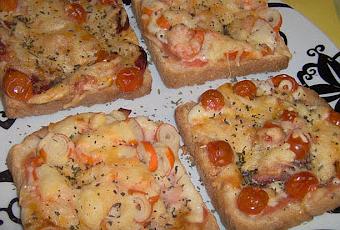Poner las rebanadas de pan el la bandeja del horno, reparte el tomate por encima, lo primero que pondrás encima del tomate es una loncha de queso , por encima el jamón, fiambre, salchichas o lo que hayas elegido, cubrelo todo con el queso rallado y espolvorea por encima con el orégano.