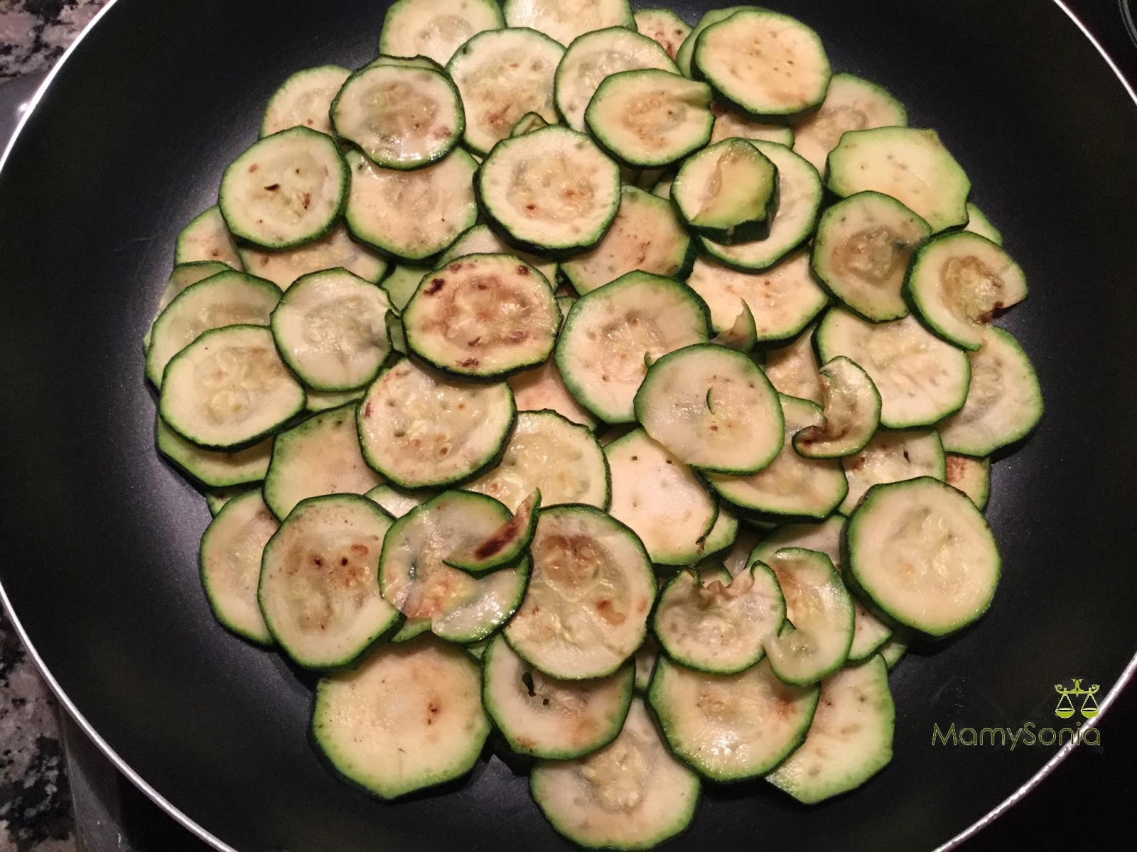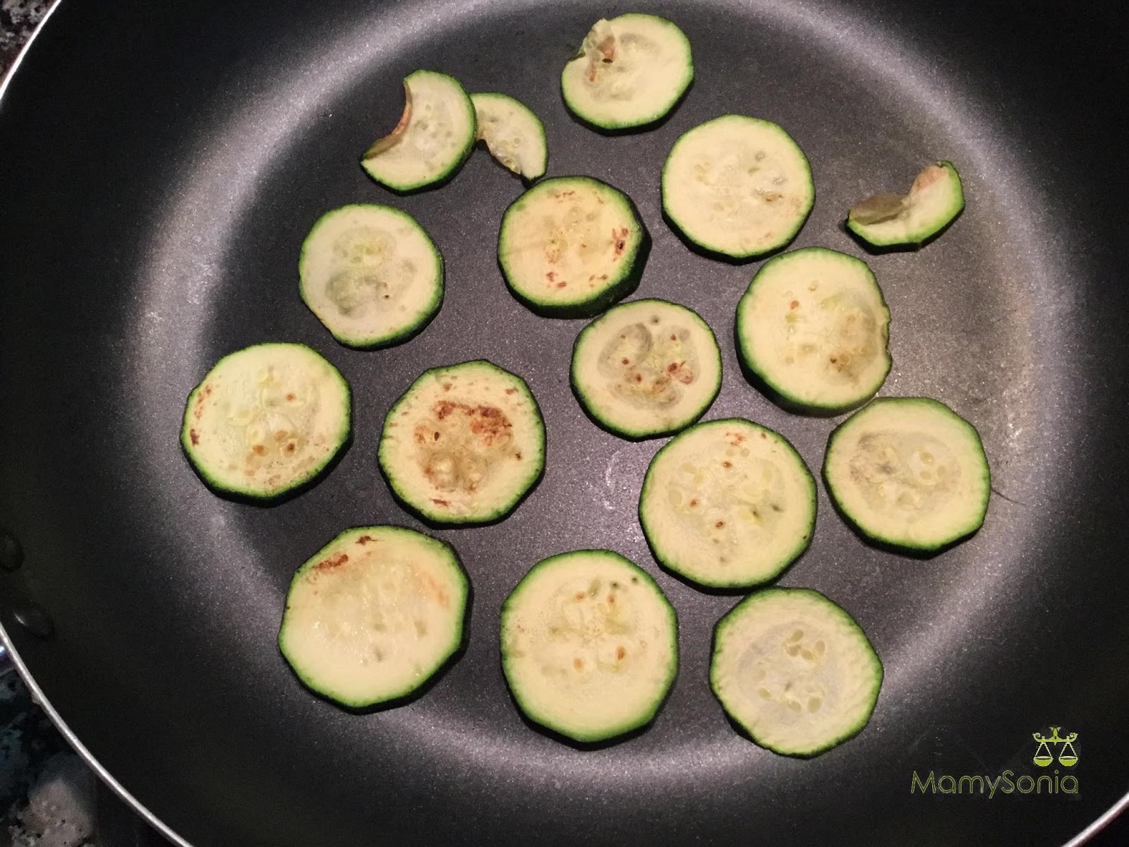 En una sartén ponemos un poco de aceite y doramos las rodajas de calabacín por ambas caras
