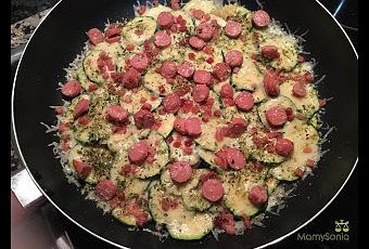 Incorporamos las salchichas cortadas, ponemos la sartén a fuego medio y tapamos hasta que el queso se haya derretido.Y ya tenemos nuestra falsa pizza.