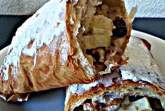 Este strudel es más falso que una moneda de 3 euros jajaja.¿Por qué? Porque está hecho con pasta filo... Pero usar pasa filo es una manera sencilla de deleitarnos con este famoso postre de una manera sencilla y rápida. Si hiciéramos la receta original la parte de la masa tendríamos que hacerla a mano y creerme que es todo un proceso muy lento de amasado, reposo y estirado... Eso si es super curioso ver como se va estirando la masa de una manera expectacular hasta quedar casi transparente. En algunas recetas usan pan rallado y en otras usan bizcochos triturados. también pueden haber variaciones en cuanto usar nueces picadas o avellanas u otros frutos secos así como incluir otras variedades de especias aromáticas.