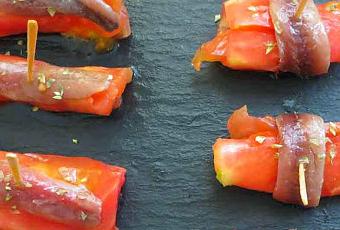 Pelar el tomate y cortarlo en rodajas finas, enrollarlo y poner sobre él una anchoa. Pinchar con un palillo, echar orégano y un chorrito de aceite de oliva virgen sobre cada rollito.