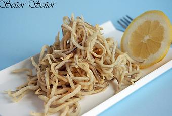 Este aperitivo tan sencillo es un acompañamiento que vi un día en un programa en Canal Cocina, el cocinero en cuestión comentaba que acompañados de limón podrían pasar perfectamente como unos "falsos chanquetes" Antes de nada quería comentar lo que es un chanquete. Los chanquetes son una especie de peces pequeños llamados Aphia minuta. Miden entre 4 y 6 cm y viven cerca de la costa del sur de España.