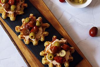 La base un gofre y después unos tomates cherry confitados y las aceitunas, una receta fácil pero que te va a asegurar un éxito si la preparas para amigos o familia.
