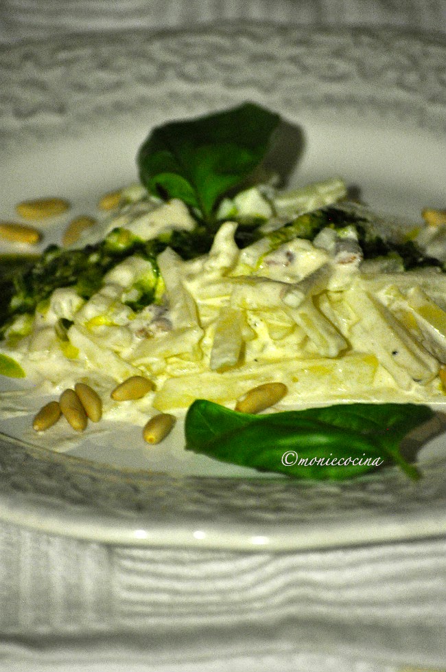 - Cuando la salsa esté en el punto espeso que queramos, añadimos los tallarines de patata, mezclamos y ponemos en el plato de servir, añadimos un para de cucharadas de pesto al gusto y decoramos con unos piñones y una hojas de albahaca. Servimos rápido que ya sabéis que las salsas de crema se enfrían enseguida. Y a disfrutar, ya me contaréis.