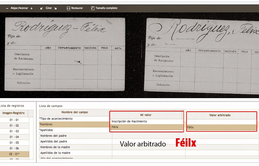 Hasta ese momento el indexador llevaba un 98% de concordancias y luego de este arbitraje su efectividad bajó al 96%. Evidentemente esto desanima a cualquiera. Es de suma importancia que una vez que nos convertimos en árbitros de FamilySearch Indexing leamos las instrucciones del Proyecto a arbitrar y sobre todo no vayamos con tanta prisa.