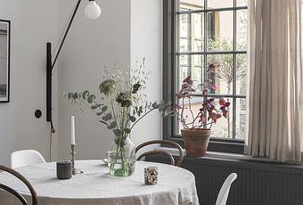 En este loft de 101 m² en Estocolmo, el gran ventanal de la entrada rematado en arco es sin duda uno de los detalles más particulares y llamativos del conjunto, igual que las vigas de acero del techo o esa escalera de metal que evoca a escaleras en fábricas.