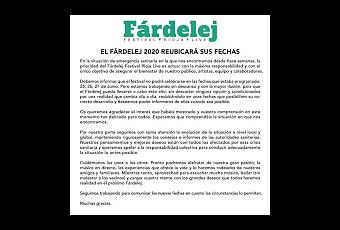 Este es el comunicado oficial. En la situación de emergencia sanitaria en la que nos encontramos desde hace semanas, la prioridad del Fárdelej Festival Rioja Live es actuar con la máxima responsabilidad y con el único objetivo de asegurar el bienestar de nuestro público, artistas, equipo y colaboradores.