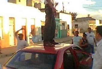 Como se ve en la foto, instigado por su mentor sube a la azotea de su casa para escandalizar con groserías y consignas. A esto los propagandistas del grupo de Fariñas llaman “una tángana” y a la respuesta de los vecinos, “turba castrista” de forma ofensiva contra sus propios vecinos.
