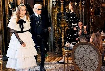 La actual musa de Chanel, Cara Delevingne cerró el desfile y posteriormente acompañó a Lagerfeld a saludar al final del show.