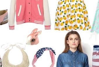 Cartera con palmeras: Bershka/Zapatos: Mödernaked/Beisbolera: Bershka/Vestido piñas: TopShop/Vestido flamencos: Planet Palmer/Anillo conejo: Mödernaked/Camisa vaquera: Bershka/Shorts bandera: Blanco/Gafas de sol: Bershka/Traje de baño cerezas: Top Vintage/Collar peter pan: ASOS/Bandana bandera: Blanco/Bolso satchel rosa: Bershka
