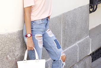 Y para dar todo el protagonismo a los jeans los combiné con tonos claros para también resaltar un poco el color que voy cogiendo poco a poco. Llevo una camiseta básica rosa palo de manga corta y unas bailarinas color maquillaje que son súper cómodas para verano porque no te suda tanto el pie y además dan un toque elegante a cualquier outfit. Escogí como accesorios mi reloj burdeos con gafas de sol burdeos a juego, mis pulseras de infinito de plata y mi bolso blanco.