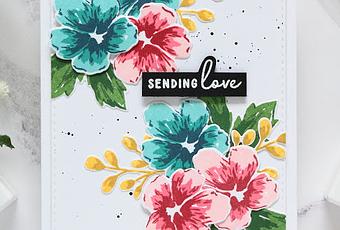 Hacer flores preciosas con este set es muy fácil. He combinado los sellos con las tintas de Concord & 9th, he troquelado las flores y hojas con los troqueles coordinados y he colocado todo en la tarjeta después de añadir unas salpicaduras negras a la cartulina.