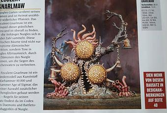 Esta imagen la han colgado hace poco en Dakka Dakka. Es una filtración de la White Dwarf de enero en su edición alemana (Os recuerdo que fue anunciada ayer). Es Feculent Gnalmaw o mas conocido como "Árbol de las Plagas" (Blight Tree). Es la figura, que por cierto van a anunciar mañana en Warhammer Community, es una especie de demonio en forma de árbol o un árbol demoníaco completamente nueva en Warhammer, que por lo que leo parece que funcionan como una especie de teleportes vivientes.