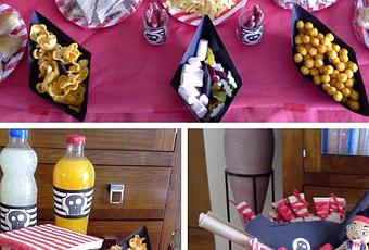 Les hice unos sombreros piratas súper sencillitos, con cartulina negra y trapillo rojo. También les hice unas espadas de cartón y, en la empuñadura, les puse trapillo también para que no se cortaran. Preparé unos barquitos de cartulina negra que utilicé de platos para chusmerías varias. Y gracias a un descargable que encontré aquí, con calaveras piratas, decoré la guirnalda, los sombreros, las botellas de bebida...todo! Y chimpún...hasta ahí llegó mi creatividad montando la mesa...como siempre, todo parece mucho más fácil de hacer cuando lo ves en fotos de otros.