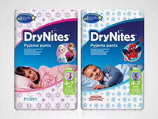 - Calzoncillos y braguitas absorbentes DryNites (diferentes tallas) para ofrecer a tu hijo una protección insuperable que le mantendrá seco y seguro toda la noche. Son como la ropa interior de verdad, diseñados para usar discretamente debajo del pijama. Ahora, además, cuentan con divertidos diseños Disney de Frozen para niñas y Marvel de Spiderman para niños.