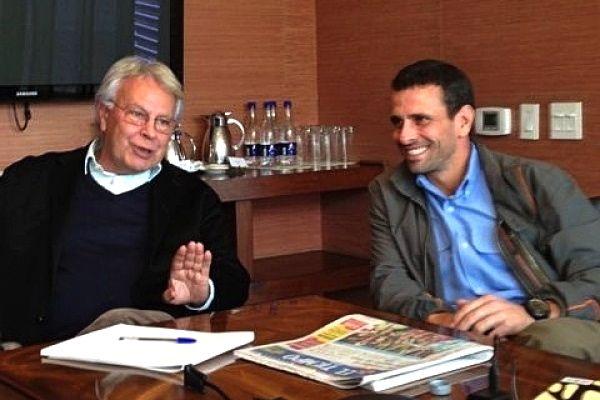 Recientemente el ex candidato presidencial venezolano y gobernador del estado Miranda, Henrique Capriles Radonski, informó a través de su cuenta de Twitter que se reunió en Bogotá, Colombia, con el ex presidente del gobierno español Felipe González, quien fuera "íntimo amigo" del ex presidente venezolano Carlos Andrés Pérez y promotor de políticas neoliberales en España y en América Latina.