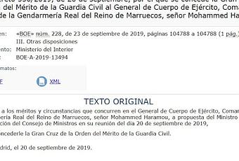 Y ahí estaba. El Real Decreto 550/2019, de 20 de septiembre, por el que el Rey Felipe VI, en connivencia con el Presidente del Gobierno en funciones y falsario mayor del reino, Pedro fake-doctor Sánchez, y con el Ministro de Interior Fernando Grande-Marlaska, conceden dicha distinción a Haramou.