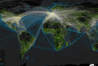 Sistema de transporte global. Las ciudades en amarillo, carreteras en verde, barcos en azul y lineas aéreas en blanco.